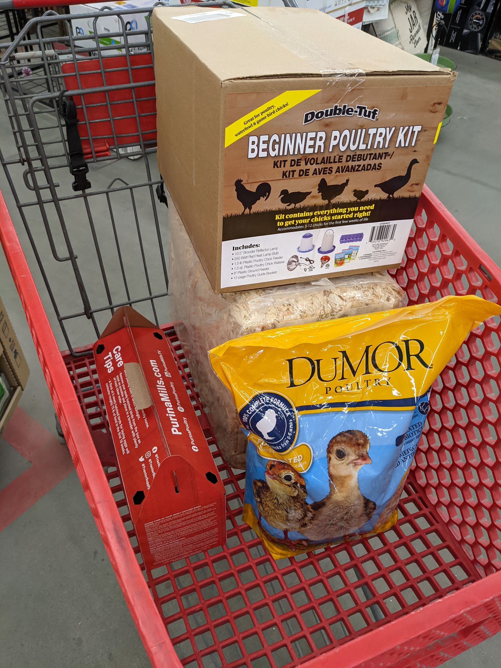 Tractor Supply makes it very easy to load up your cart with a beginner poultry kit that has a starter watering can, feed containers, and a hanging heat lamp with bulb. I added a package of large flake shavings and a bag of organic starter feed and we were on our way. Â