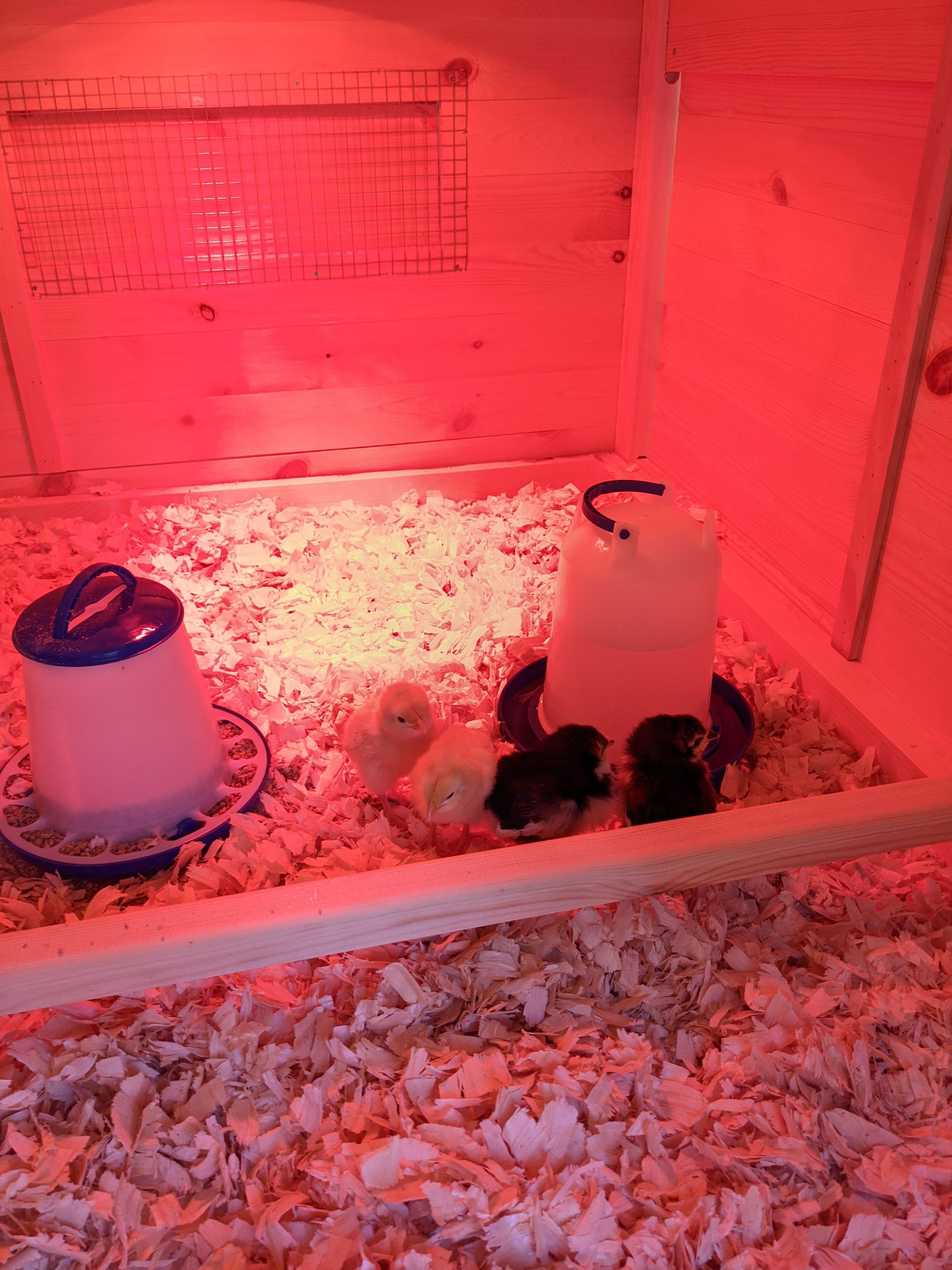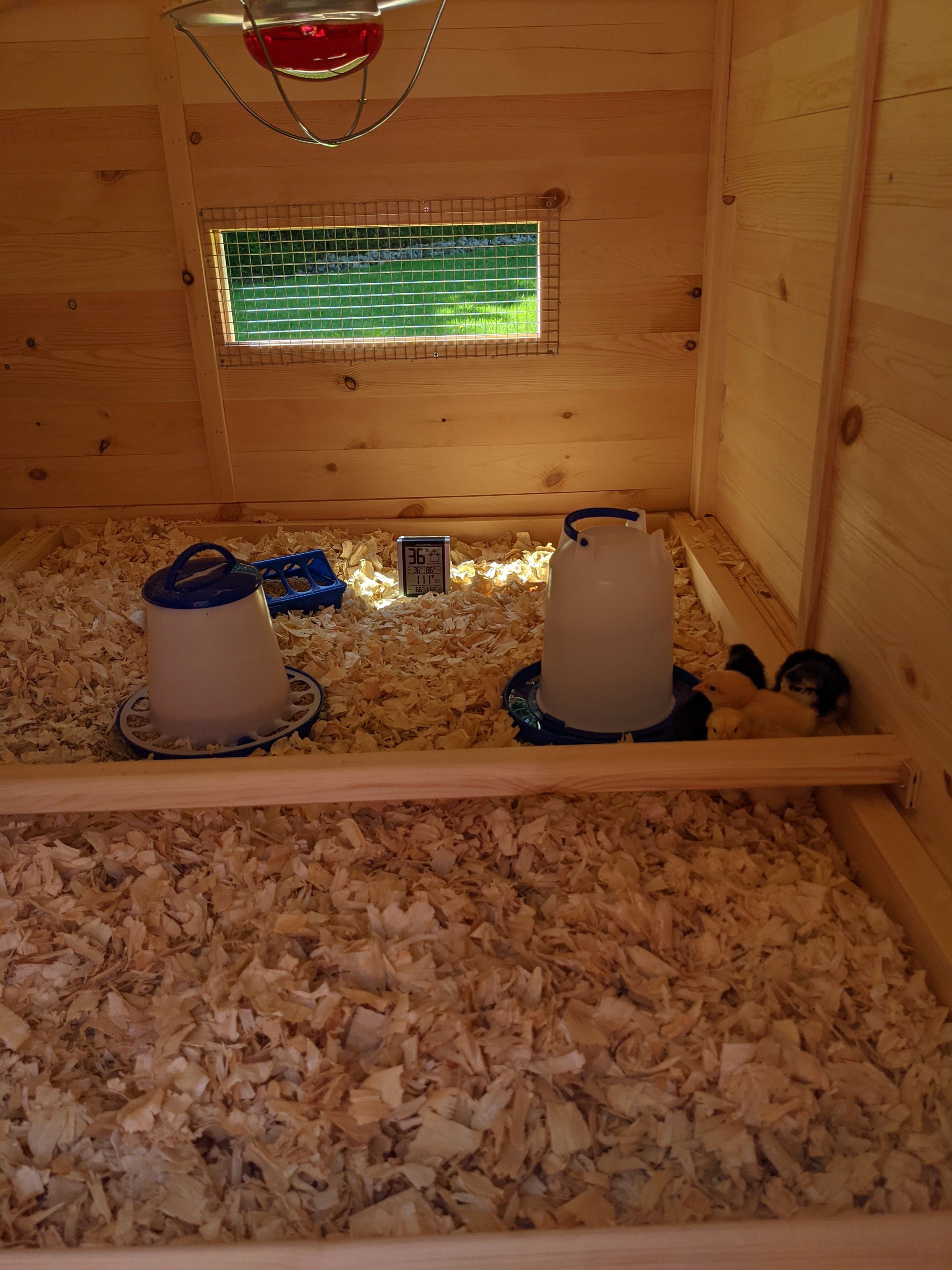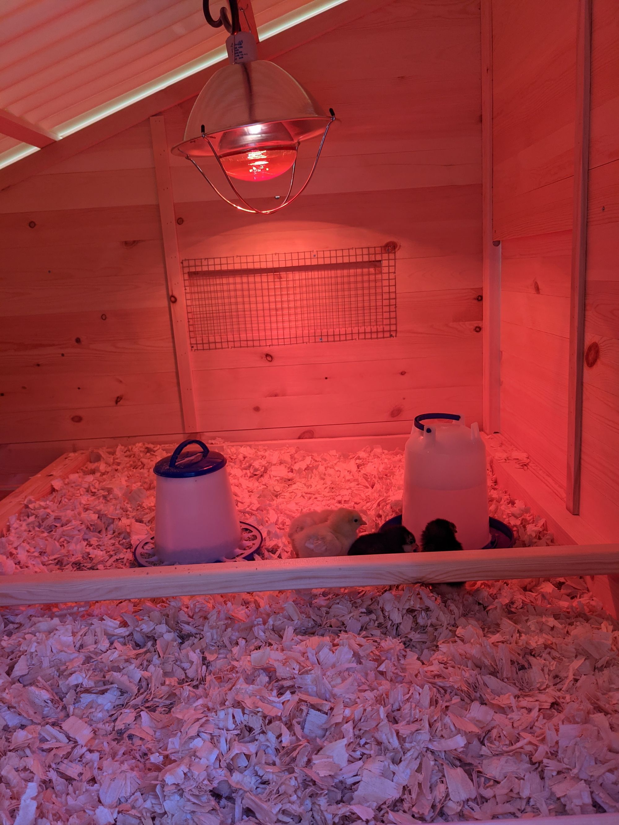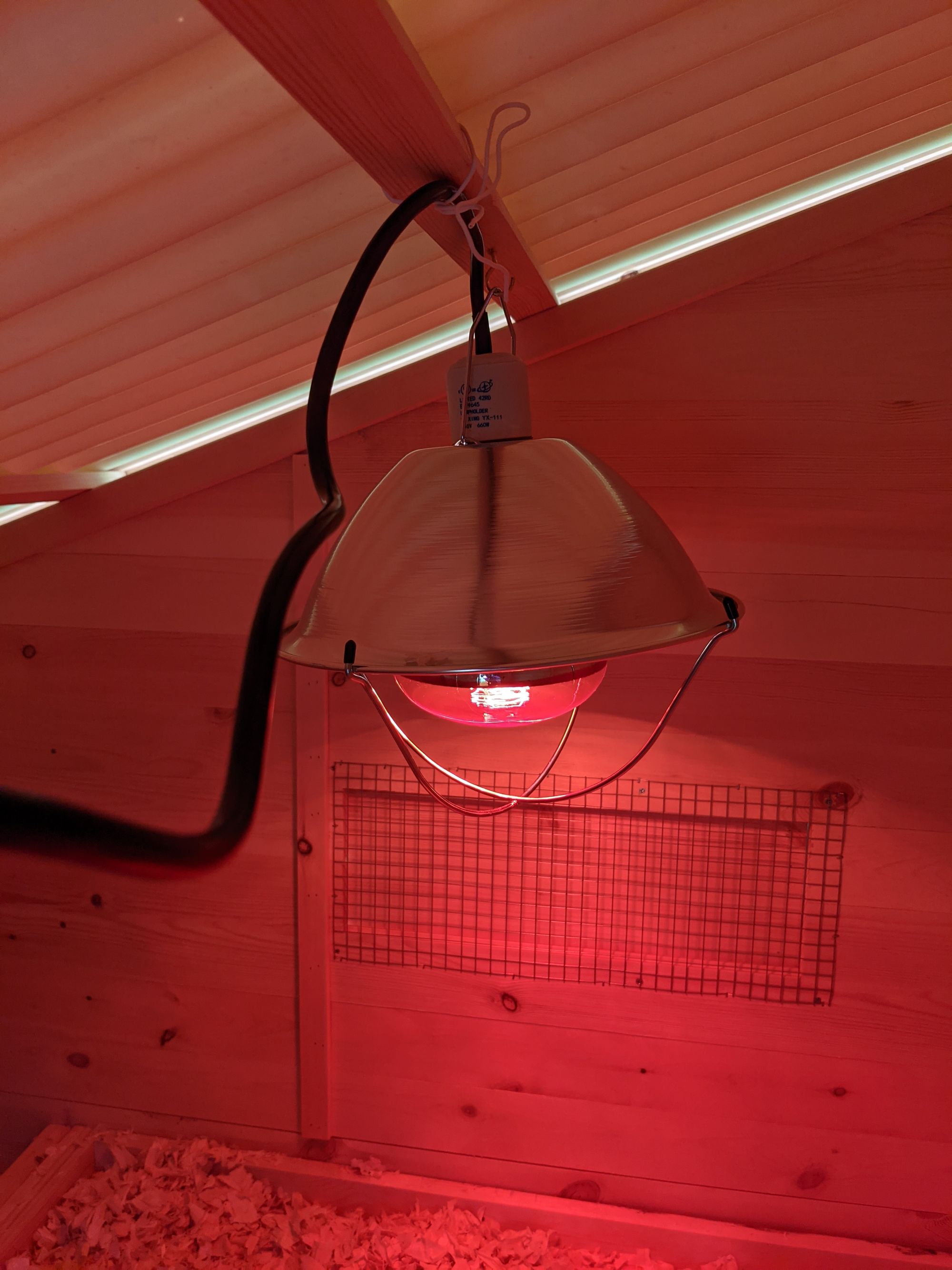 Once we got home, everything went fairly smoothly. I pulled out the sliding drawer and filled it with shavings then placed the food and water inside. I rigged the heat lamp overhead with a hook I screwed into the upper beam. The lamp came with a handy clamp but I didn't feel there was anything solid enough to clamp onto that satisfied my fire hazard concerns. The heat lamps get very hot so I wanted to be sure it wasn't going to fall down or get knocked off. If you have some good 2x4 sized beams in your coop, the clamps work great and I've used them a lot in the past but this coop didn't have anything beefy enough so I hung it from a hook instead.