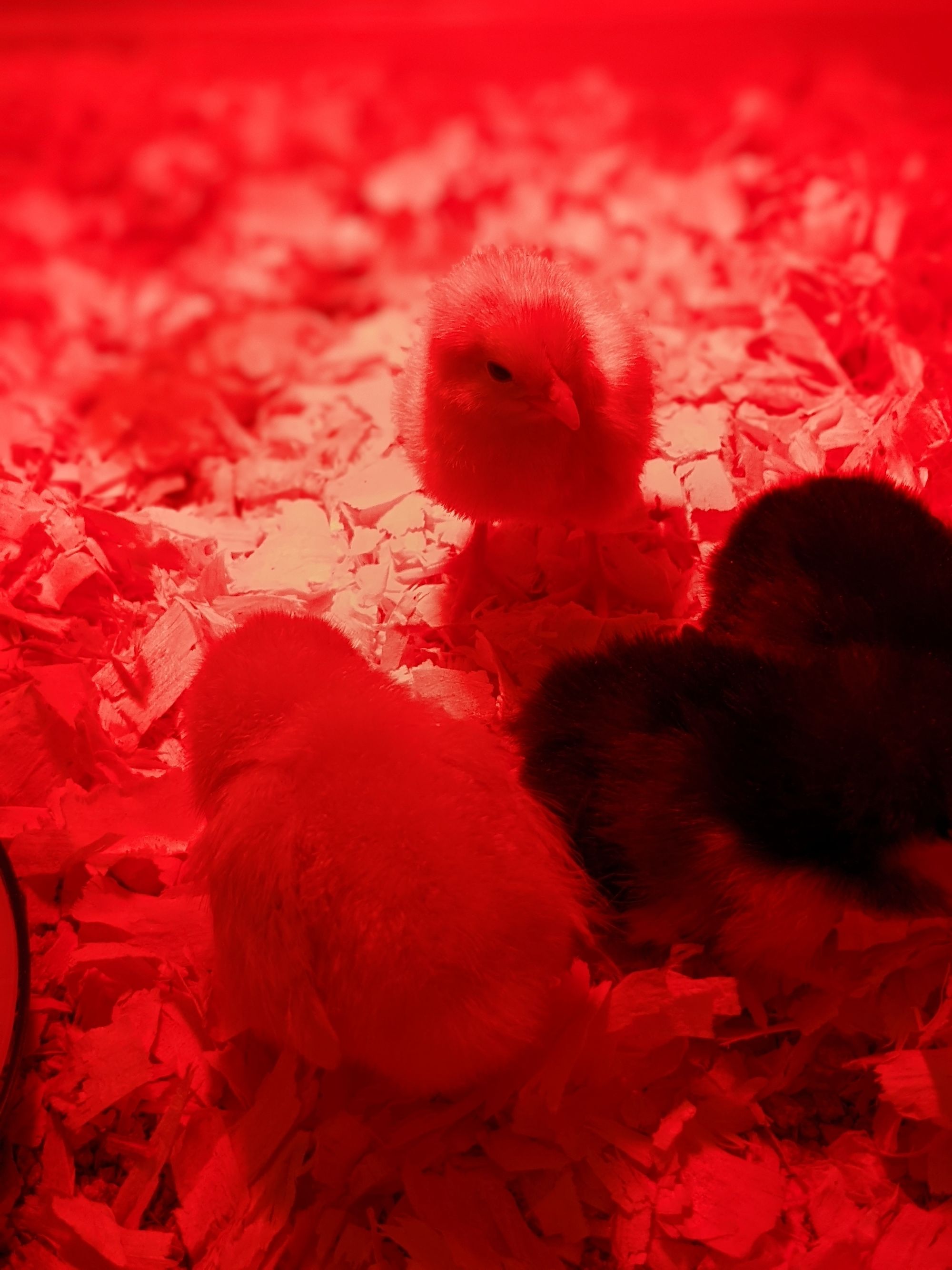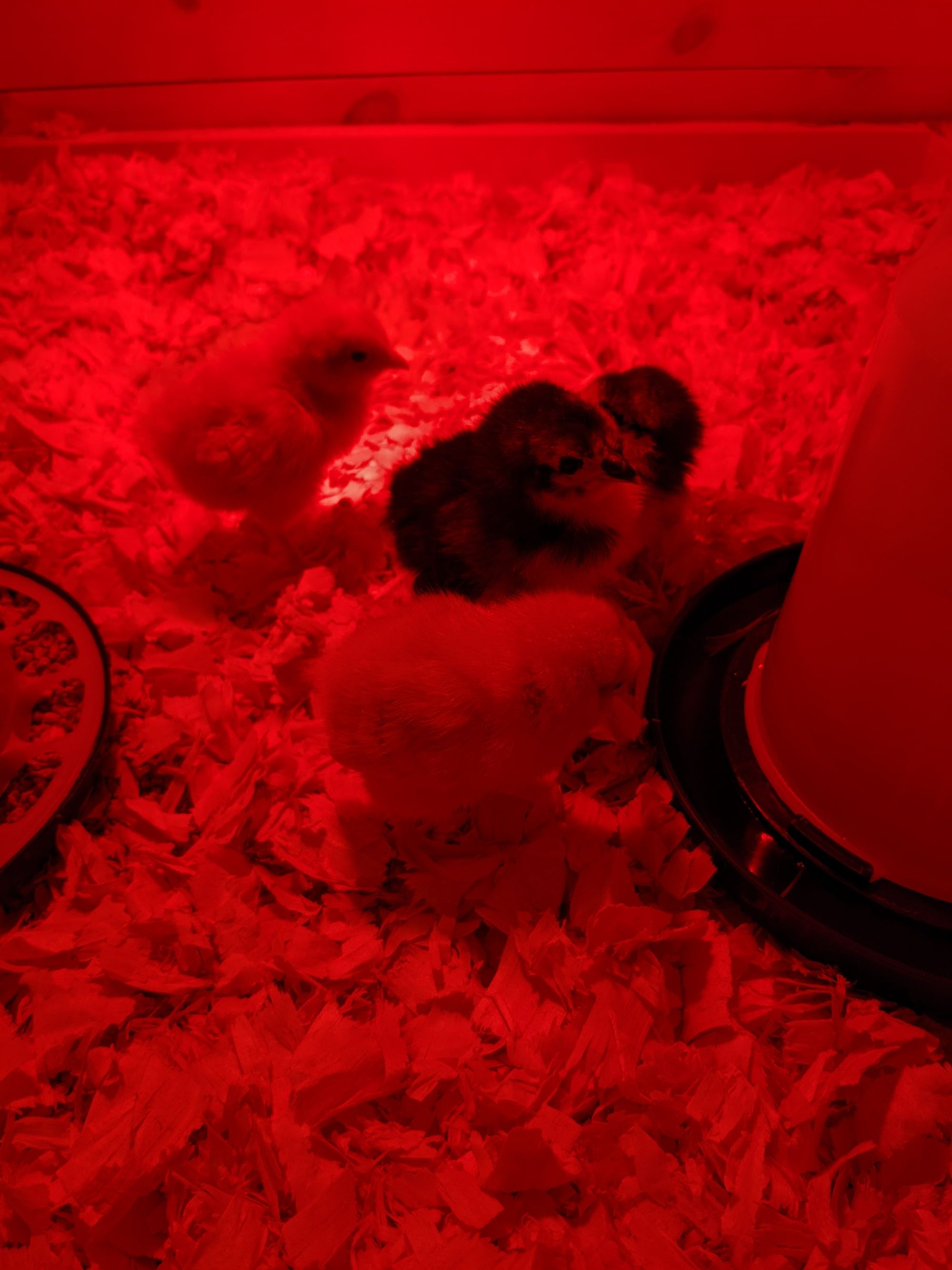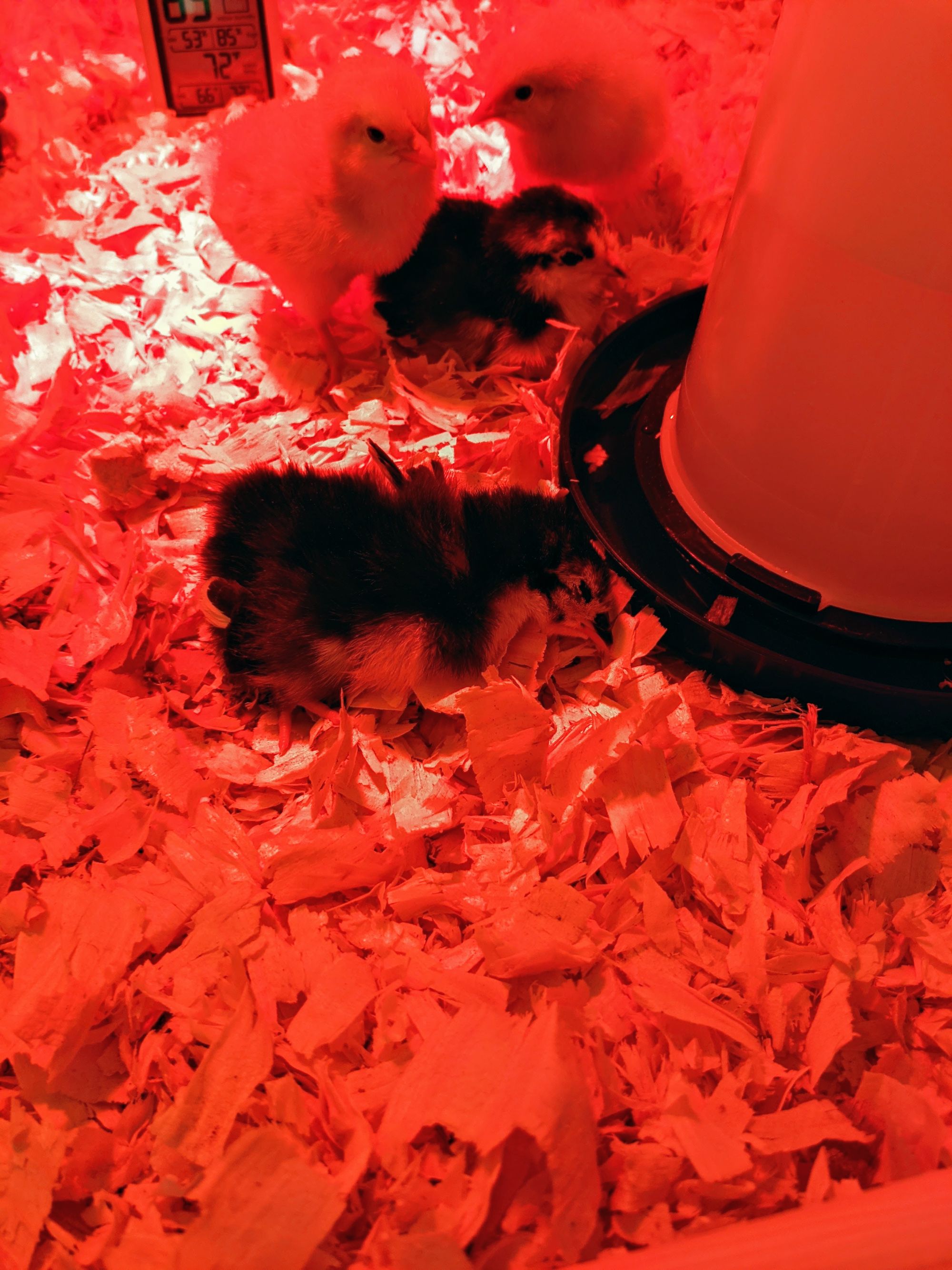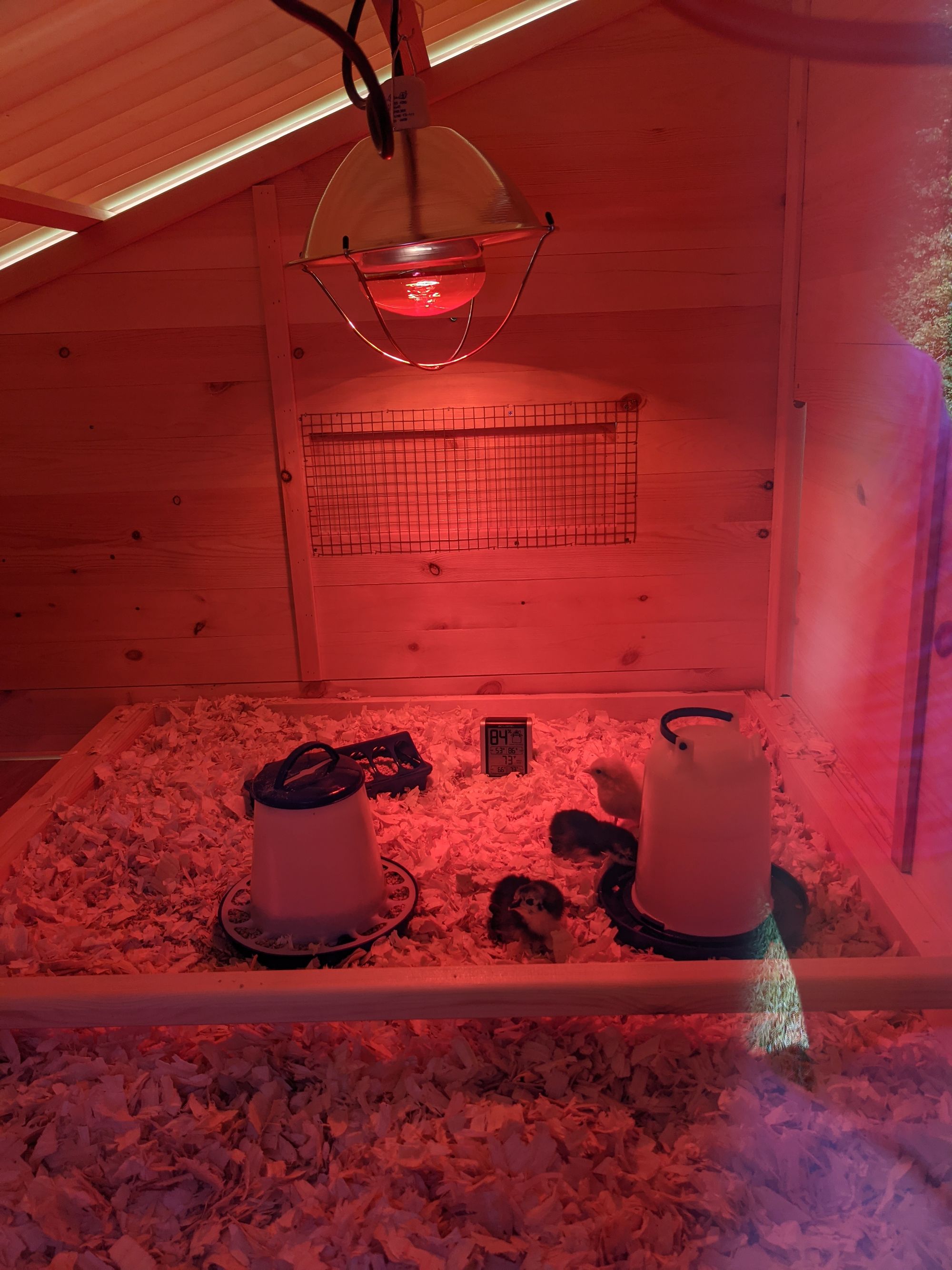 Once the heat lamp was in place, I introduced the girls to their new digs. They settled right in, eating and drinking right away. I forgot how much they nap when they are babies and how they pile on top of each other and also zonk out so hard they look like they gave up the ghost. I couldn't tell how warm it was in the coop so I snagged my temperature reader from my 3D printing studio and placed it a bit under the heat lamp. It was at about 85 degrees or so and climbing so I cleaned up the area and grabbed a drink while I waited for it to get a true reading. When I returned, the chicks were cheeping away and were huddled at the other side of the coop. The temp read 111 degrees. Oops! They must have thought they part of a roast chicken dinner menu. I unplugged the lamp and it's warm enough today that they don't need it. Plus, I keep running out there every 20 minutes to make sure they are okay. I think they are getting sick of me peering through the window all the time. Tonight should be interesting and I wonder if I will get any sleep at all.