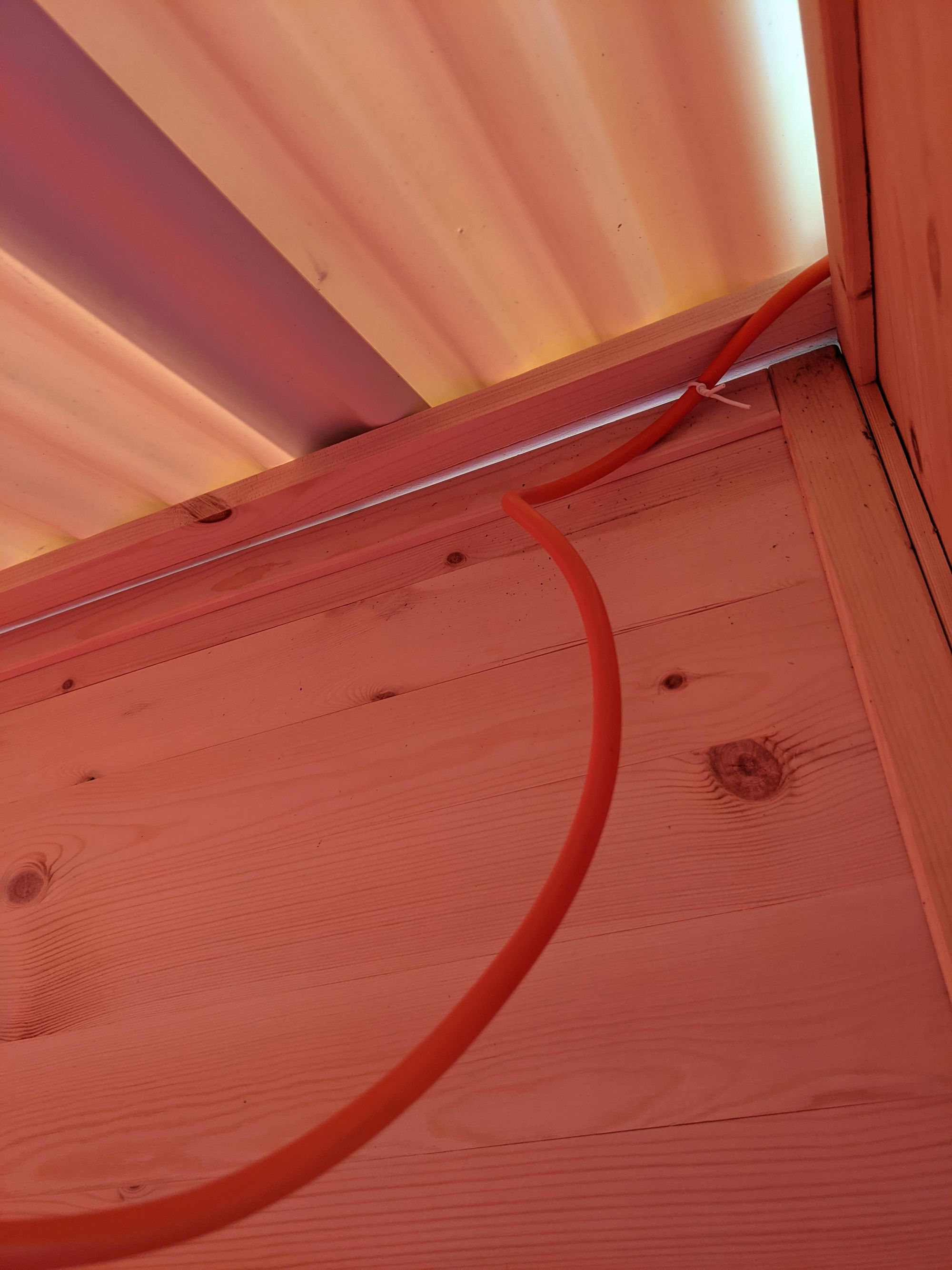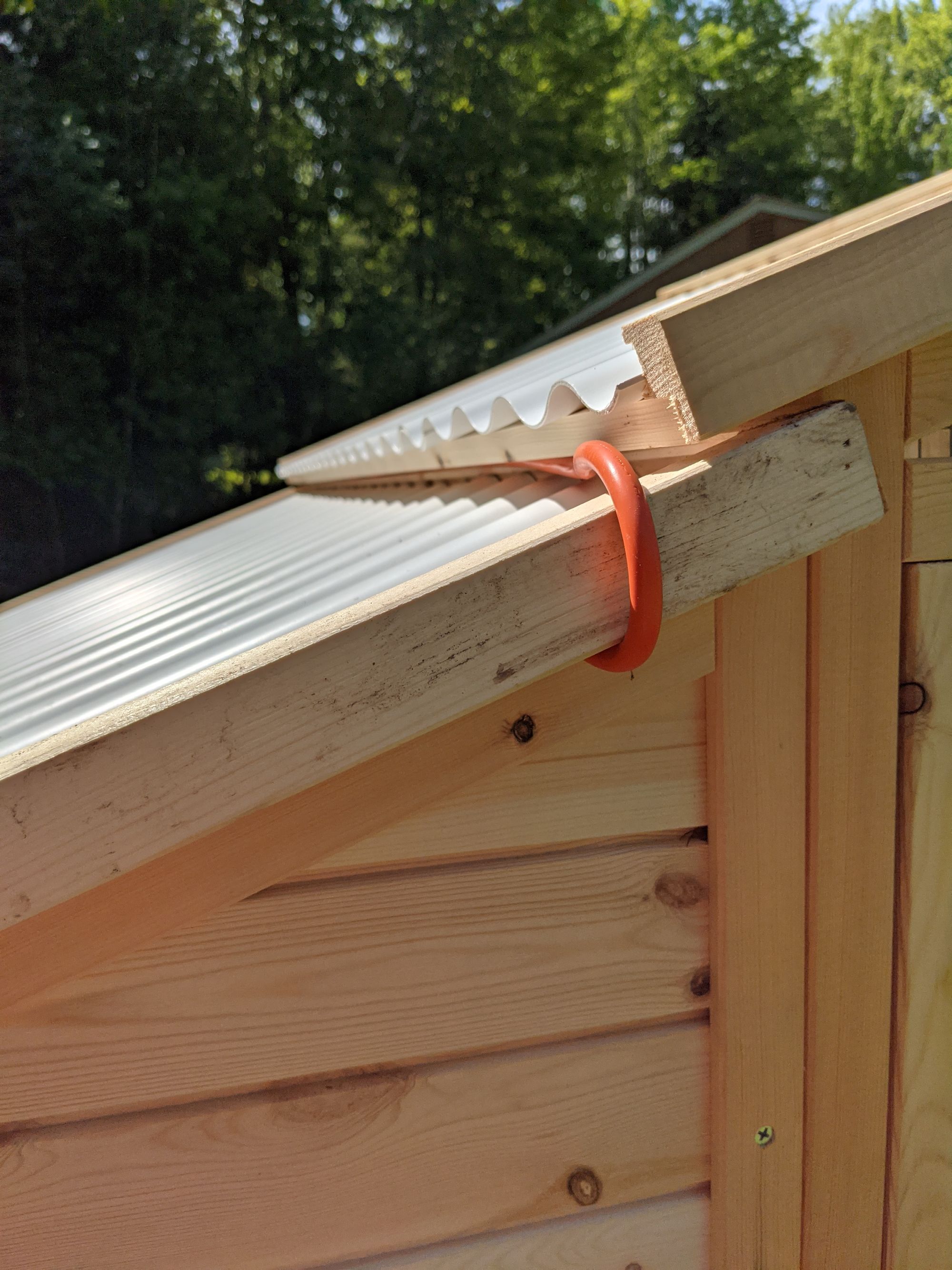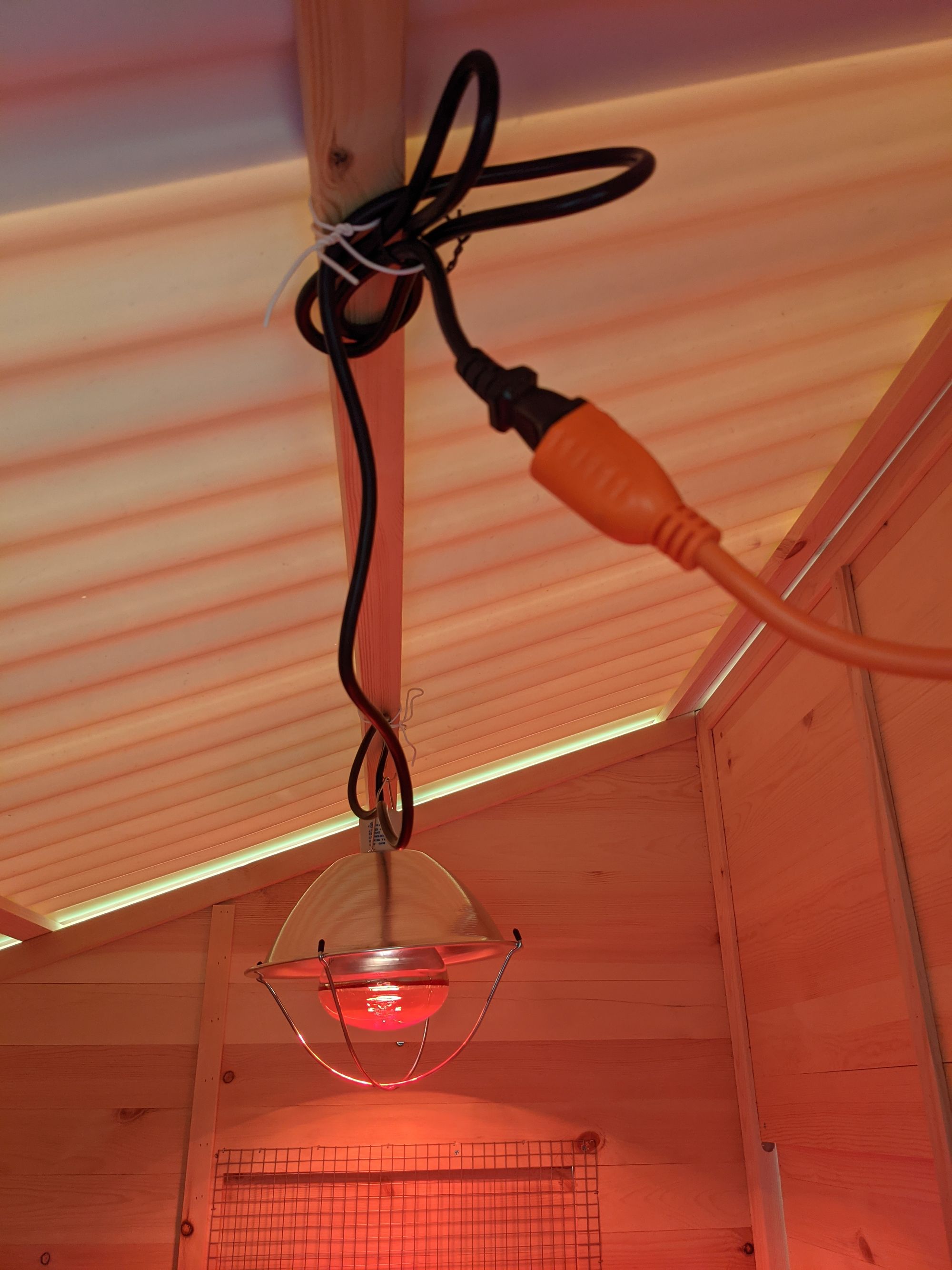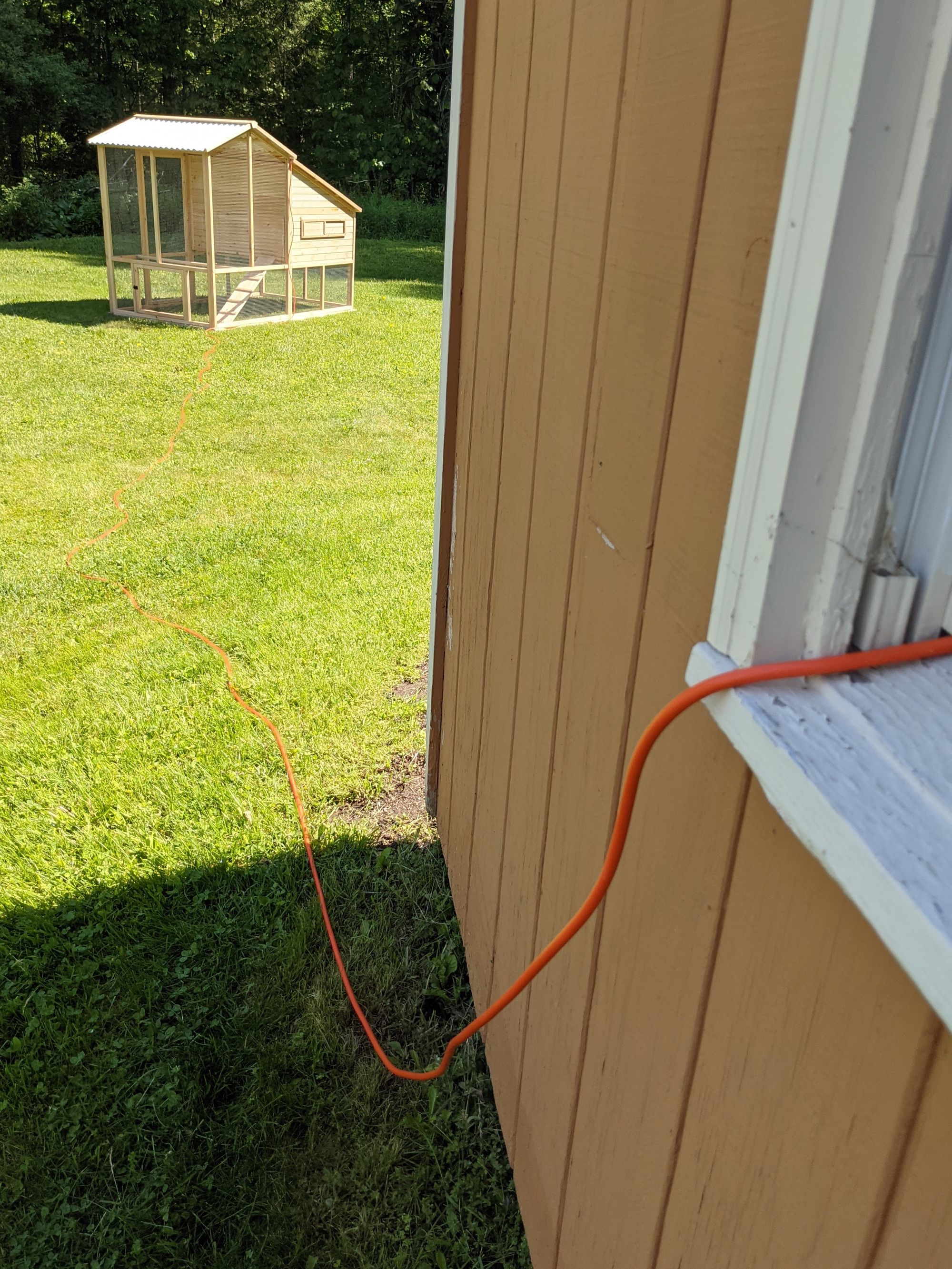 I did have to rig the extension cord from the garage out to the coop. I did this by running the cord out the garage window and then weaved it under the roof frame of the coop. This actually required me to unscrew the roof so I could pass the plug through but it wasn't hard to do at all. I used some twisty ties to run all the cords along the inside roof of the coop and voila! I can reach the plug from just inside the door so I can unplug and plug it in without any trouble which is a good thing since we are currently experiencing heatwave weather and it's too hot to run the lamp during the day.