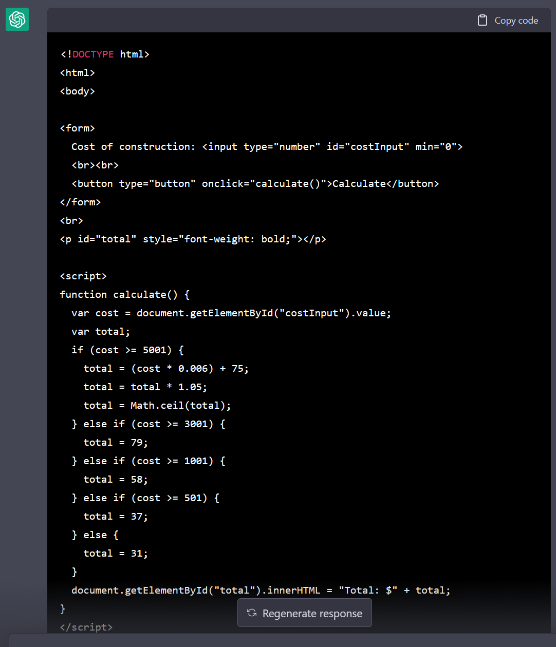 ChatGPT: > This code creates a simple form with a field to enter the cost of construction, and a button to calculate the total cost. The JavaScript function "calculate()" is called when the button is clicked. It first gets the value of the cost input field and assigns it to the variable "cost". It then checks the value of "cost" against different conditions using if-else statements, and assigns the appropriate total cost to the "total" variable. Finally, it displays the "total" in a "p" element with the id "total" and the style "font-weight: bold;".
